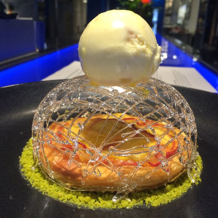 “At Hakkasan we always try and use local and seasonal produce where possible. The Orchard peach tart is a great example of that, the local peaches are sliced very thinly and then baked for just a couple of minutes to release the juices so it still tastes very fresh,” Rory Macdonald, Executive Pastry Chef of Hakkasan USA told JustLuxe. “Working with Catherine Kim we created the crystallized ginger ices cream which has a slight kick to it which compliments the tartness of the peach. The presentation is kind of old school.”