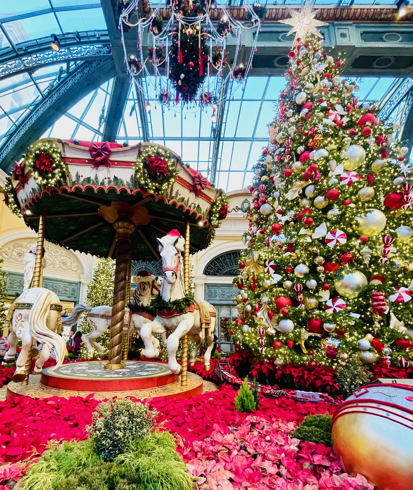 Guests take selfies near the slowly spinning three-horse vintage-style carousel. Nearby is a stunning 42-foot holiday decorated tree with a sparkling Swarovski star at the top. Below are 10,000 mini-LED lights and 8,700 ornaments.