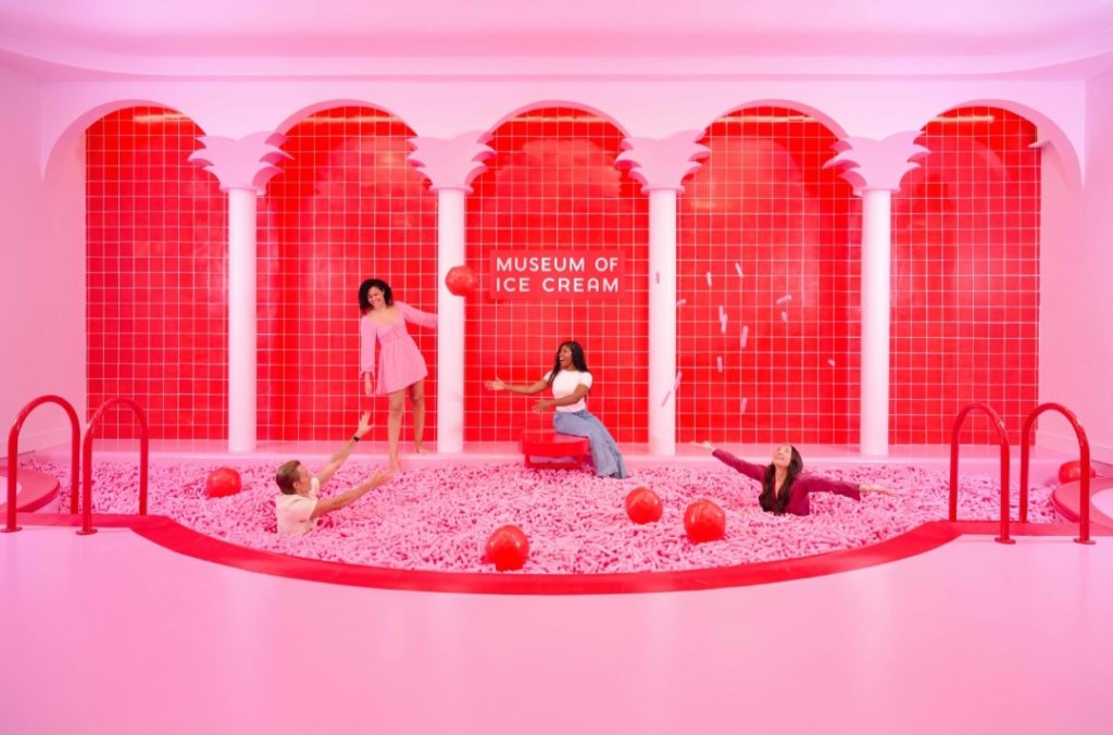 A retro-inspired 'Cream Liner,' a 1960s-style luxury airplane, transports visitors into the fun sensory experience, with a flight attendant serving scoops down the aisle directly from an ice cream cart. There are playful Miami-themed surprises at every corner, whether you’re sliding down into the Versace Mansion-inspired sprinkle pool or entering a hidden beach room with pink palm trees in the Grand Hall of Freezers. Each experience, from the banana jungle to the carnival game room with mini golf and colorful pinatas, is meticulously curated to provide a picture-perfect backdrop, blending the vibrant spirit of the Magic City while celebrating all things sweet.