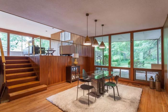 The two-story estate features modern design, floor-to-ceiling windows, a wrap-around balcony, outdoor terrace and a playhouse. Next to the house sits a two-bedroom guest residence with a living area and bathroom. According to the Charlotte Business Journal, “the buyers intended to restore the Modernist home and preserve its 24 acres along the banks of Morgan Creek.”