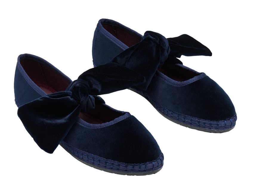 Soft cotton velvet with matching piping and bow detail; soles crafted from recycled bicycle tyres. Understated luxury with sustainability credentials — a conscious, stylish holiday gift.