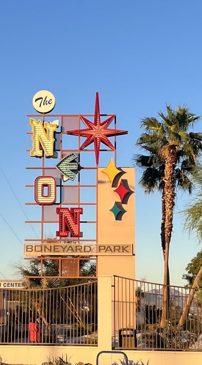 Walking through the Neon Museum Boneyard at twilight is one of those memorable experiences that combine past with present, through the great design in neon designage. The lighted past is palpable here, yet its past is friendly and welcoming. It beckoned then, as it does now as we still move toward the light.
