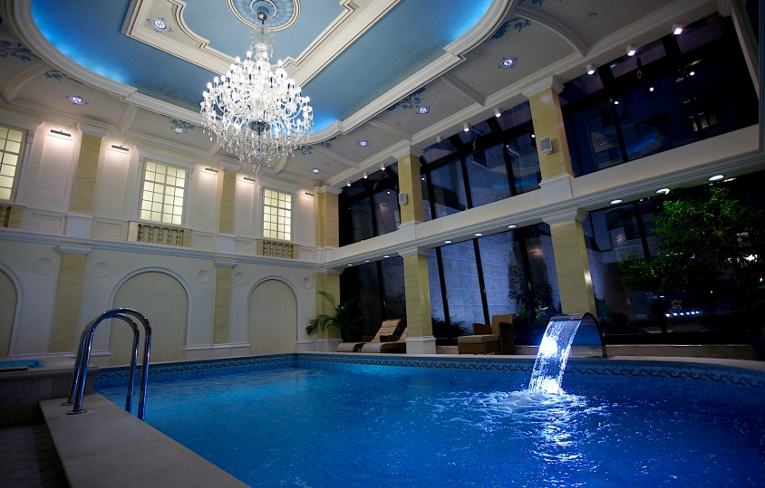 Wellness The u-shaped, building's ground floor features a spacious lobby, an in-house restaurant and a retro classical styled SPA comprising an in-door heated swimming pool, dry-sauna, Jacuzzi, and a fully equipped fitness center. The swimming pool has an 8 m' high solarium wall which overlooks a meticulously designed courtyard and garden, where you can have a drink or a light meal on our Summer Porch.
