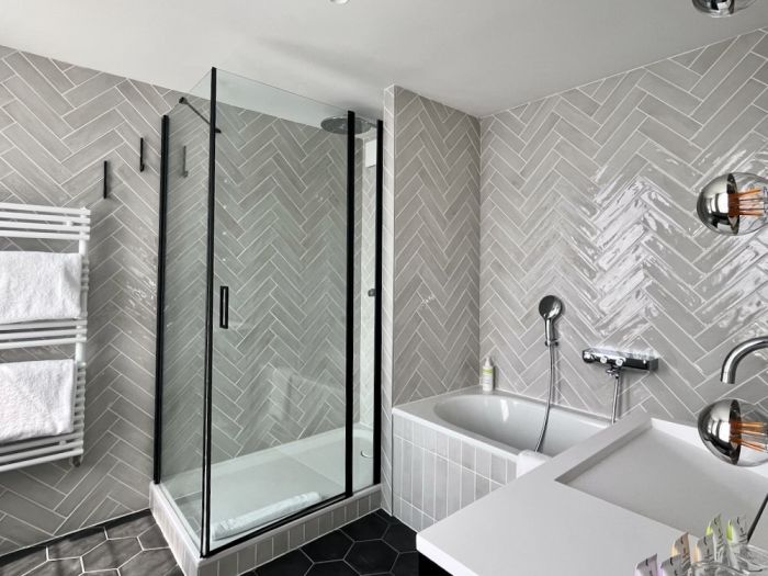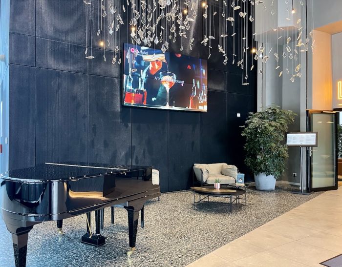 Inside, the lobby reflects this powerful sense of scale, with a spacious floor area and a high sweeping ceiling overhead. Overhanging sets of crystals create a dream-like interplay of shadow and light on the cream colored floor. Decor is contemporary with a hint of art deco and industrial design with wrought-iron stanchions and covered piping above, all painted in black and grey muted tones. A gleaming grand piano pays tribute to the building’s erstwhile heritage as a former factory making this particular musical instrument.
