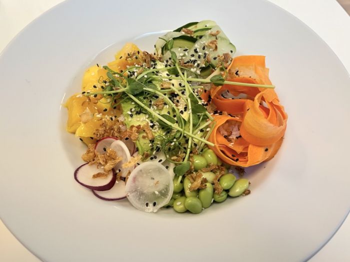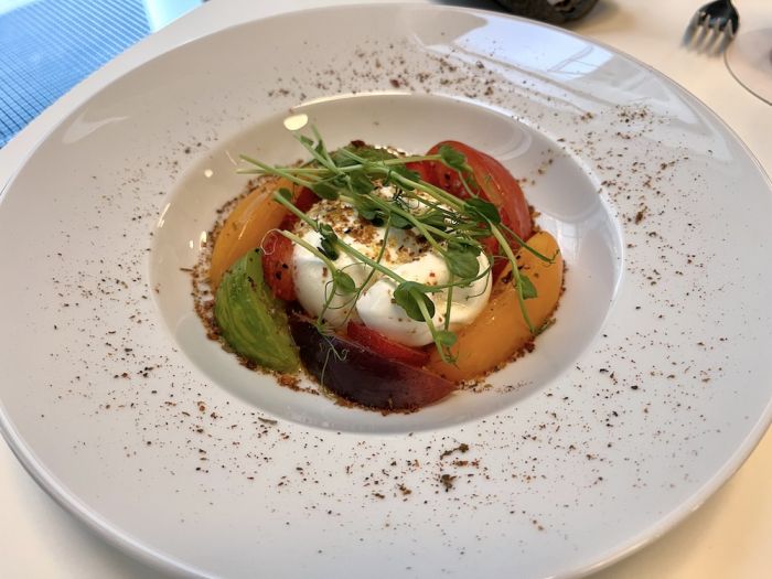 It features a speckled tiled floor, a bar along one wall with counter-style seating, and bench and table seating throughout the restaurant. My companion chose as her starter a polk bowl of Thai rice, edamame beans, carrots, cucumber, mango, avocado, radish and sesame seeds. Mine was creamy burrata with heirloom tomatoes and red berries drizzled with aromatic oils.