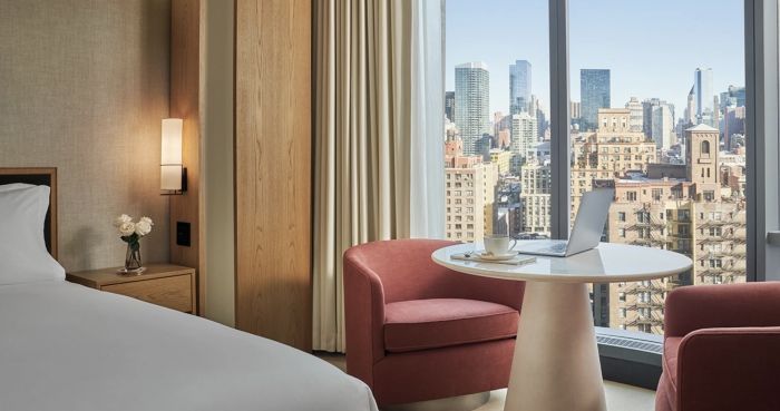 The rooms carry this ethos forward. In a corner suite, floor-to-ceiling windows frame Hudson Yards’ towers and the verdant rooftop gardens of neighboring buildings, blending cityscape with sanctuary. A polished stone table is ready for work, while a chaise invites a midday pause or a late-night glass of Malbec as city lights flicker below. Mosaic-accented bathrooms, plush linens, and understated art create spaces that are restorative, stylish, and distinctly Manhattan. John Gachot reflects, “The building is beautiful, so we had such great things to work with — it was really a dream project,” highlighting the interplay of architecture, light, and material throughout the property.