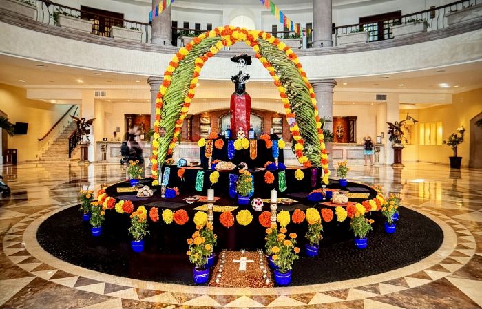 Learn about the items and decorations at each ofrenda altar. The decorations honoring loved ones are usually adorned with marigolds, candles, favorite food and beverage items, and special offerings that guests will discover throughout the resorts.