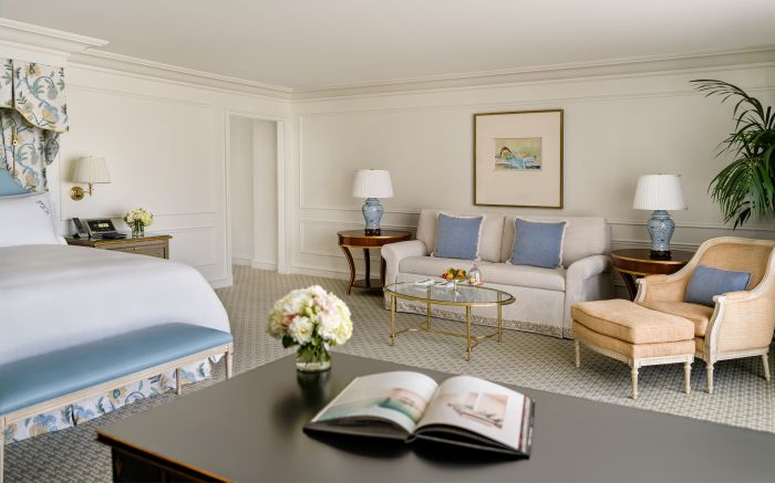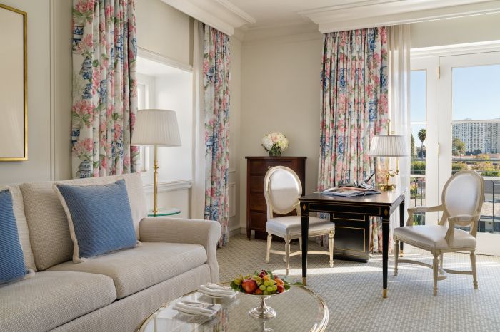 The hotel partnered with leading global interior design firm Hirsch Bedner Associates to refresh the property’s French-inspired aesthetic. Decorative accent pieces such as porcelain vases, gold-framed mirrors, and soft metallic sconces were added to underscore the property’s charm and feminine character.
