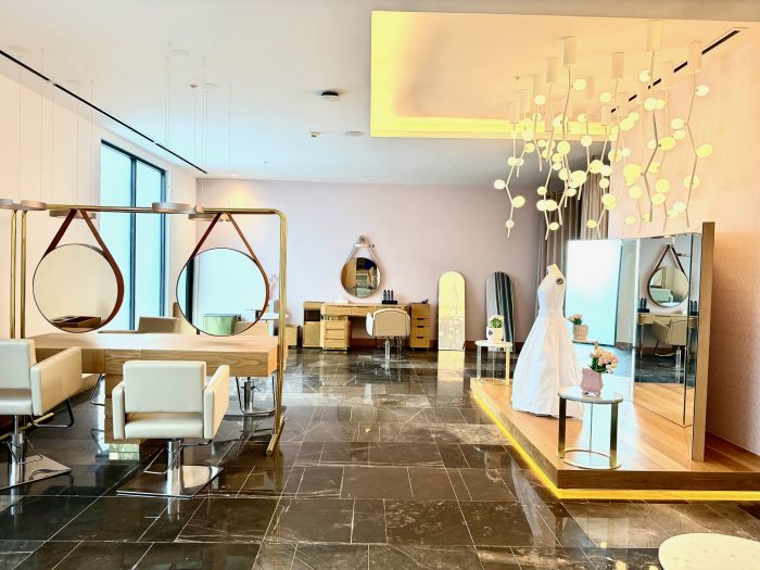 Afterwards, don a robe to attend a mindful soundbath meditation together. Then venture back into the bridal suite to have your hair styled and makeup applied for the big day.