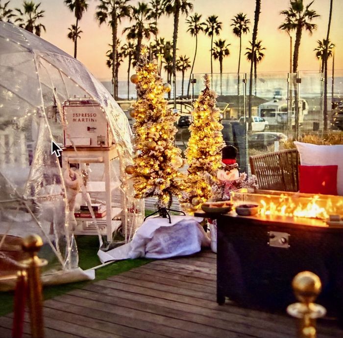 There are five themed holiday igloos that can accommodate up to 8 guests. Plus, there is a new 'Share the Mana (Spirit)' large igloo for up to 12 guests. Reserve a Winter Wonderland igloo, Modern Mexico, From Park City to Surf City, Apres Ski, North Pole Rodeo or the largest one. They start at $159 for up to a two hour stay. Receive complimentary Pellegrino soft drinks. Food and cocktails are available at an additional fee.