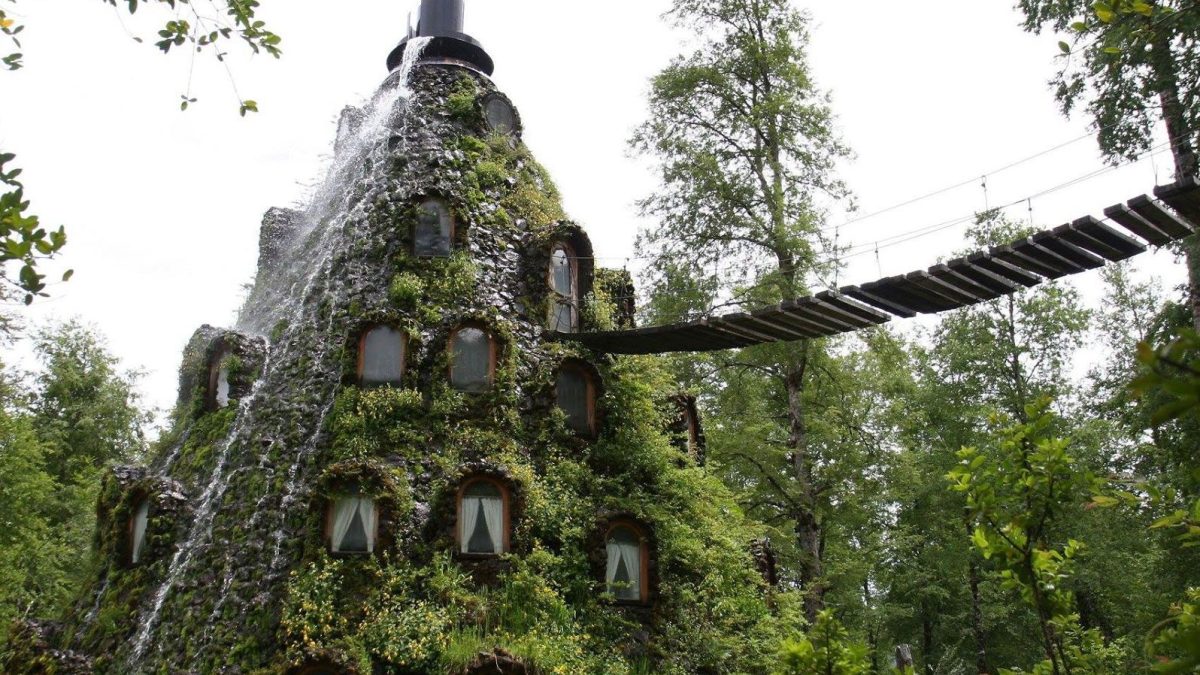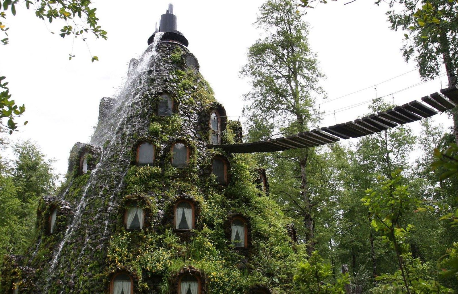 The first hotel built at Huilo Huilo is without a doubt one of the most unique buildings I’ve ever seen. Montaña Mágica Lodge is an otherworldly, cone-shaped structure, studded with windows and covered with vegetation. This man-made mountain boasts a waterfall that runs from the top of the structure down the outside wall and through the reception area before it exits the building by cascading over a stone wall in the hotel’s restaurant. This water feature sets the tone for everything you will see at the resort. The property has 12 cozy, fairytale-style rooms, with rounded wood walls give you the feeling that you’re staying inside a particularly comfortable tree.