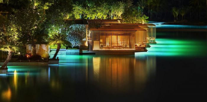 Because it is illegal to swim in the South China Sea, the property pumps 10 million gallons of water from the surrounding ocean into its 21,527-square-foot, salt-water pool every 32 hours. On the north shore, it boasts a white sand beach and guests can swim, paddle board, sail or kayak in the ocean throughout the day. Around the pool are meditation grounds, coconut palms and other indigenous trees, most of which were sourced directly from the island.