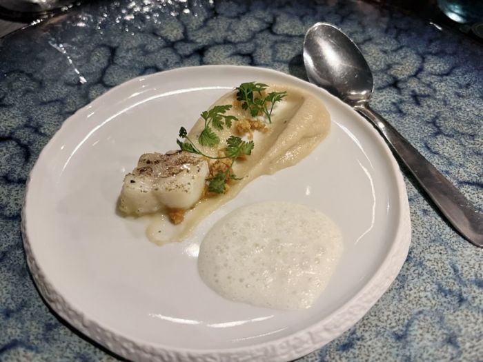 Our young servers, Elias and Flavie, translated dishes from French to English for us Anglophiles, starting with our first course, an amuse bouche of white fish, turnip puree, and herb foam.