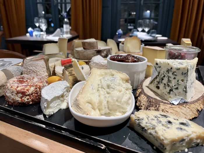 On a trolley wheeled proudly table-side by Fabian. I counted 27 different varieties, including Roquefort blue, goat’s cheese, one flavored with truffles, and another with walnuts from the Dordogne region, as well as Tommes, a semi-hard, often round cheese, including Corsican and smoked Tomme d’Estaing from the Larzac region in France. Gelee of poppy and melon accompanied our selection, with my companion choosing a pineau, a blend of fresh grape juice and Cognac, as her aperitif.