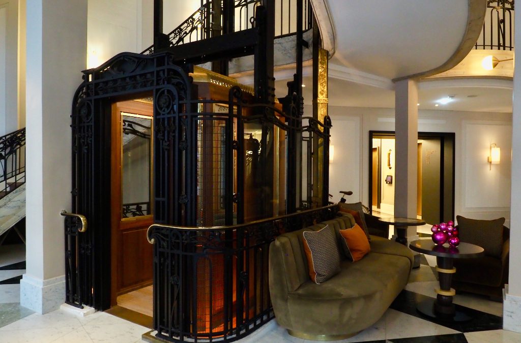Two vintage wood, brass, iron and mirrored elevators just inside the lobby of the recently-opened 5-star hotel enhance its iconic image even more. Over 100-years old, the elevators are protected by French law, as is its historic façade.