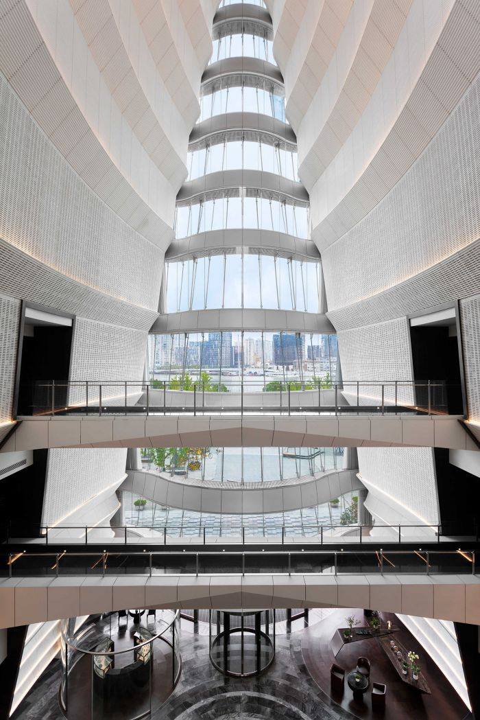 The forward-thinking design of the hotel was inspired by the surrounding neighborhood, the city’s rich history and unique culture, as well as the vitality of the Huangpu River it sits upon. Water elements inspired by the river seamlessly unify the exterior and interior of the building with its curves and textures.