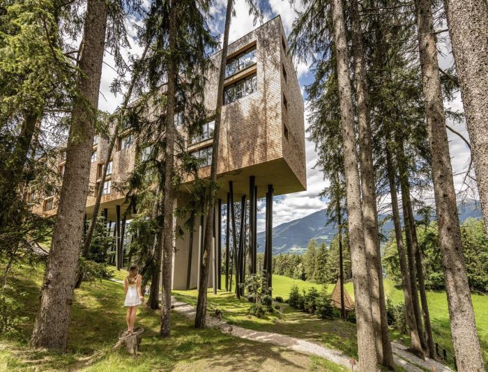 Few places offer luxury accommodations as an adults-only treehouse, let alone above a picturesque town more than 1,000 years old. My Arbor lures guests from all over Europe for its uncanny rooms set aloft ancient fir pines, extensive sauna and spa services, and a pristine setting by Brixen, the oldest town in South Tyrol where medieval church bells still ring nearby the Dolomites and Sarntal Alps.