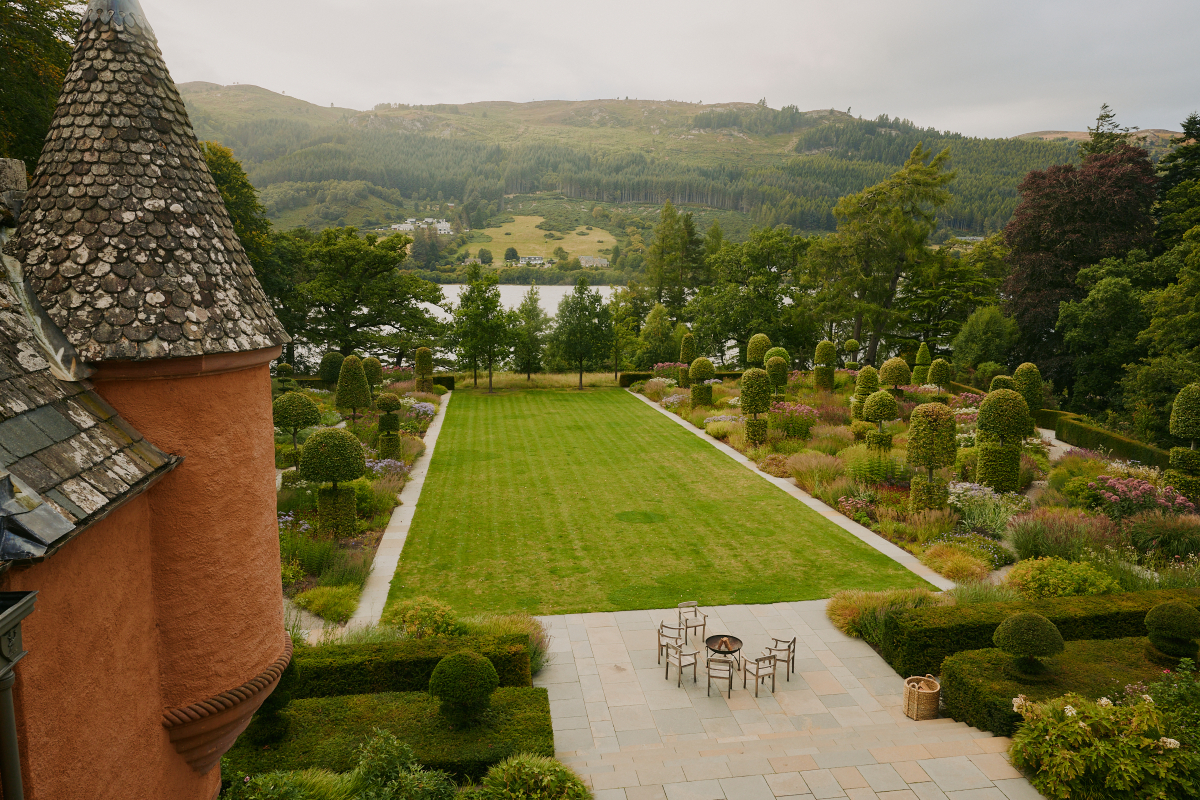 The expansive lawns of Aldourie Castle reach to Loch Ness and host charity events, Highland games, and special occasions.