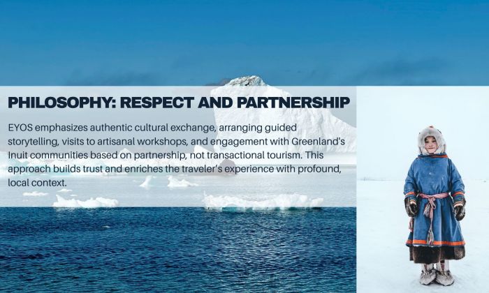 - Indigenous Engagement: EYOS emphasizes authentic cultural exchange, arranging guided storytelling, visits to artisanal workshops, and engagement with Greenland's Inuit communities based on partnership, not transactional tourism. This approach builds trust and enriches the traveler’s experience with profound, local context.