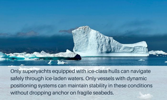 Only superyachts equipped with ice-class hulls can navigate safely through ice-laden waters. Only vessels with dynamic positioning systems can maintain stability in these conditions without dropping anchor on fragile seabeds.