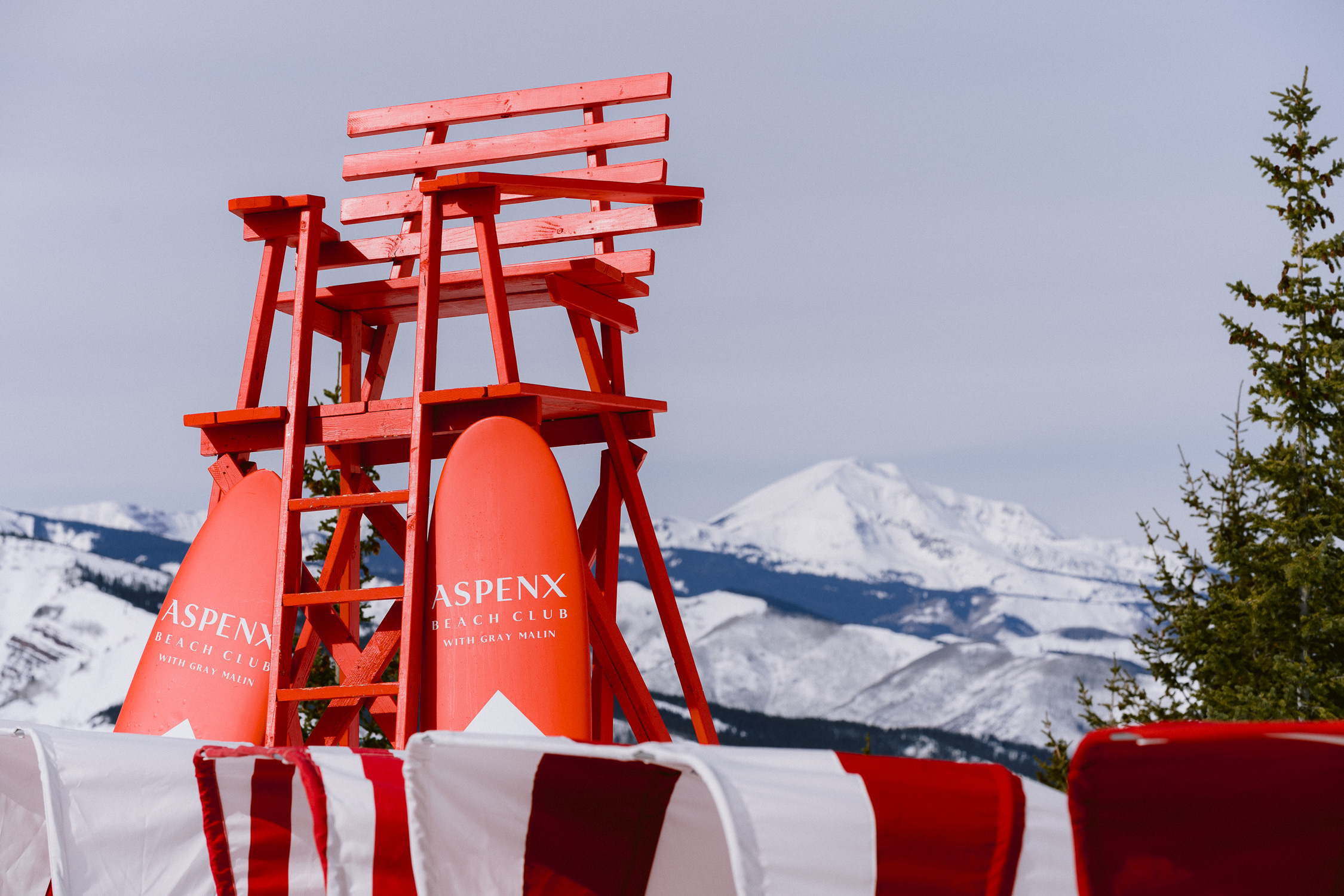 Situated at the peak of Aspen Mountain, AspenX Beach Club is a chic winter experience that invites both avid skiers and non-skiing party goers to enjoy après-ski festivities on Aspen’s postcard perfect slopes. With striped cabanas, lounge chairs, and panoramic views, the AspenX Beach Club is the perfect place to enjoy Aspen’s picturesque mountainscape and glamorous social scene. Curated by renowned lifestyle photographer Gray Malin, AspenX Beach Club merges the ski-chic style of the AspenX brand, with dedicated service, and Malin’s signature vibrant aesthetic. The venue is a Gray Malin photograph come to life, complete with 360-degree views of the surrounding slopes and peaks, red and white striped cabanas, and the Instagram-worthy red lifeguard tower with its matching custom longboard. The seasonal pop-up party is exclusive and limited to 100-guests per day. Live DJ sets, special events, and gourmet dining bring the party to life and create the energy of a beach party; where guests can mingle under sunny skies, lounge on striped chaise chairs, and order signature spritzes, bottles of rosé, or even a three-course meal with unlimited Dom Pérignon.