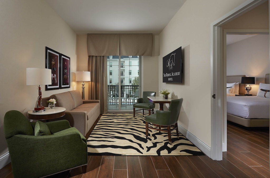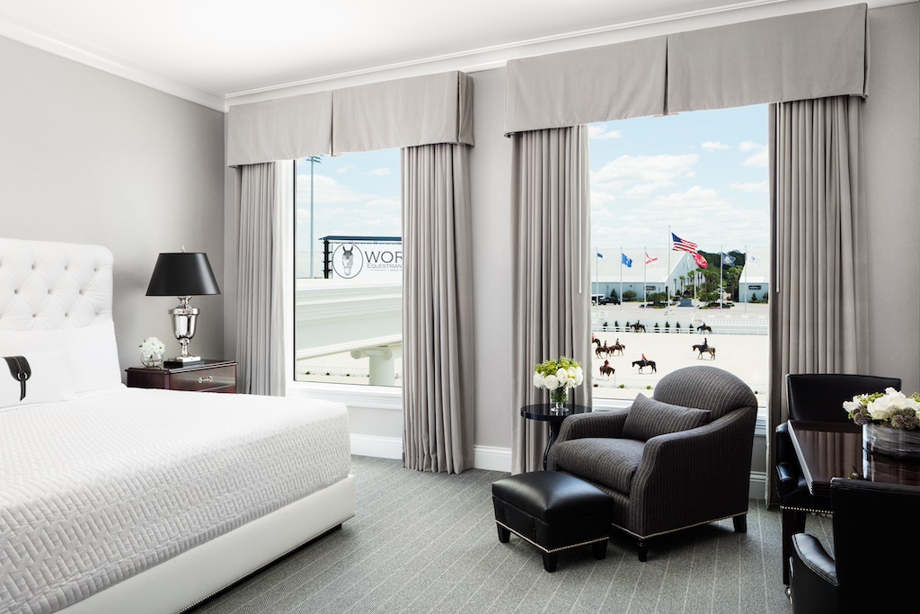 Many of the 248 guest rooms and suites overlook the Grand Arena, giving guests a private, front-row view of the world-class competitions taking place at any given time. Interiors are white-walled and luminous, offset by black furniture and playful equestrian accents — the kind that whisper “you’re in horse country.” Marble bathrooms and custom details like stirrup hardware add a quiet richness to every room.